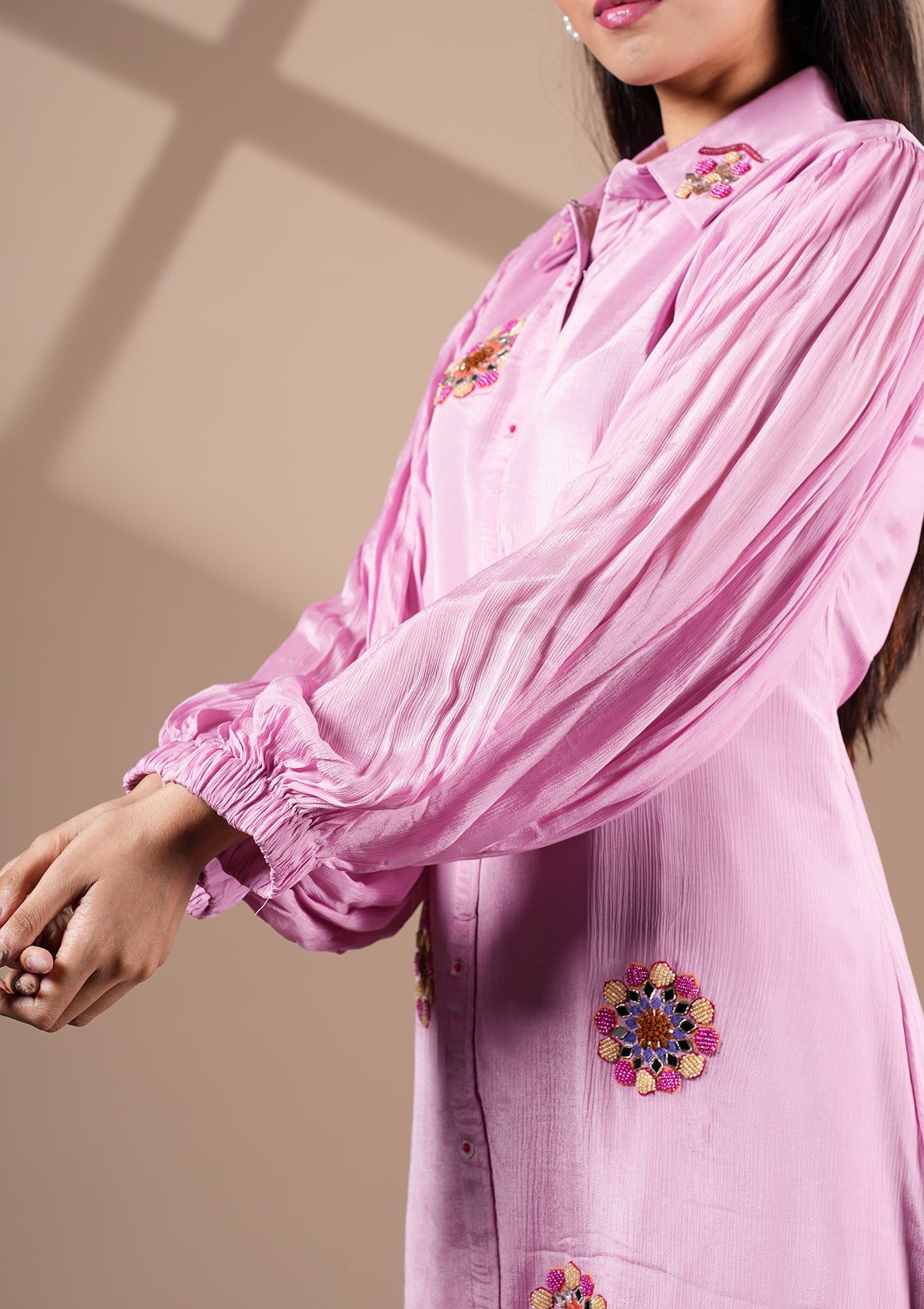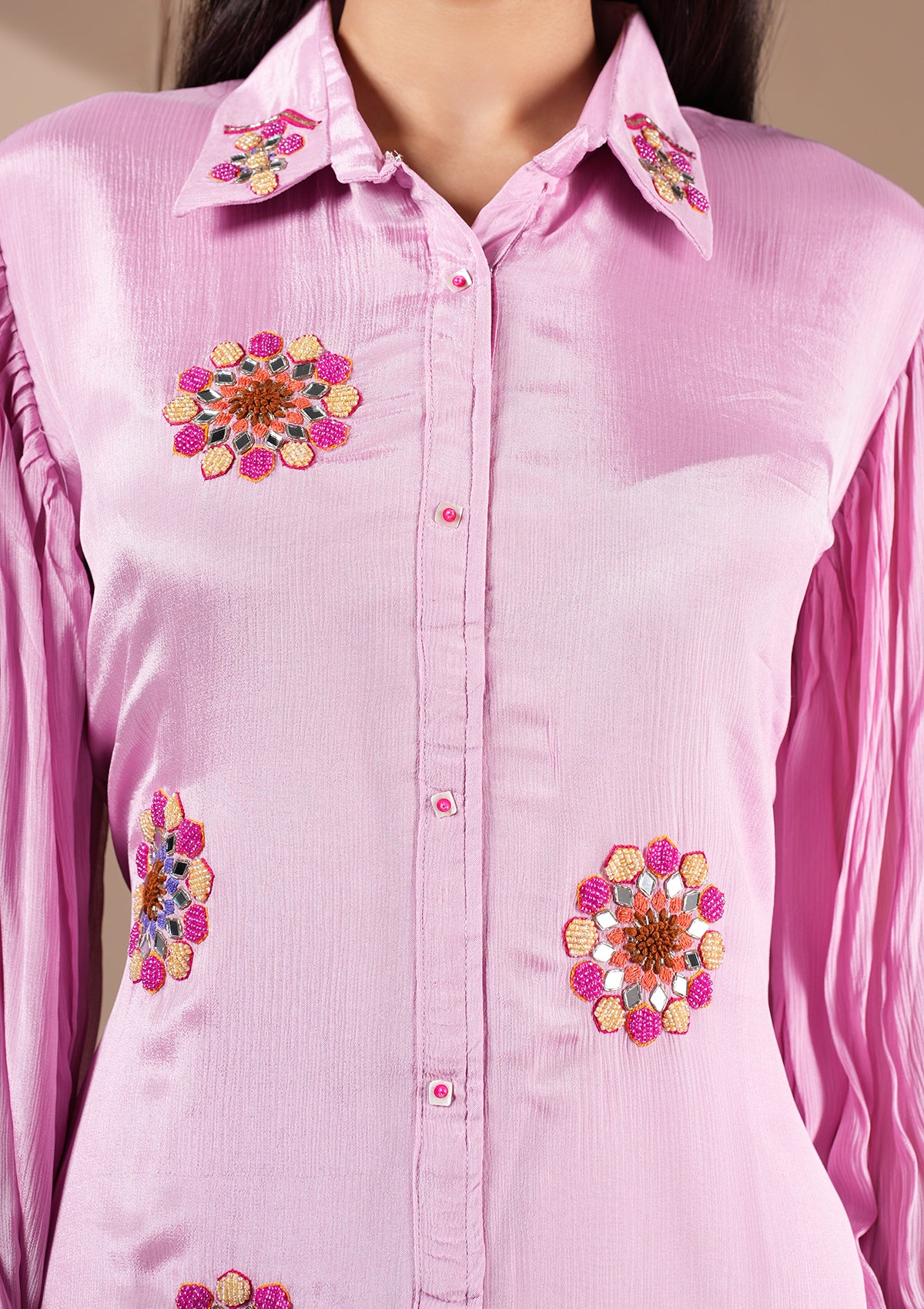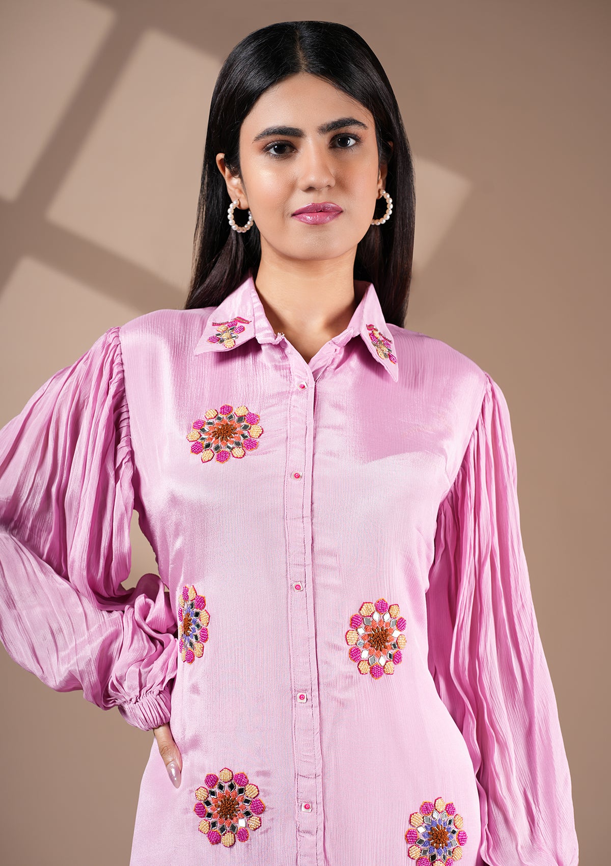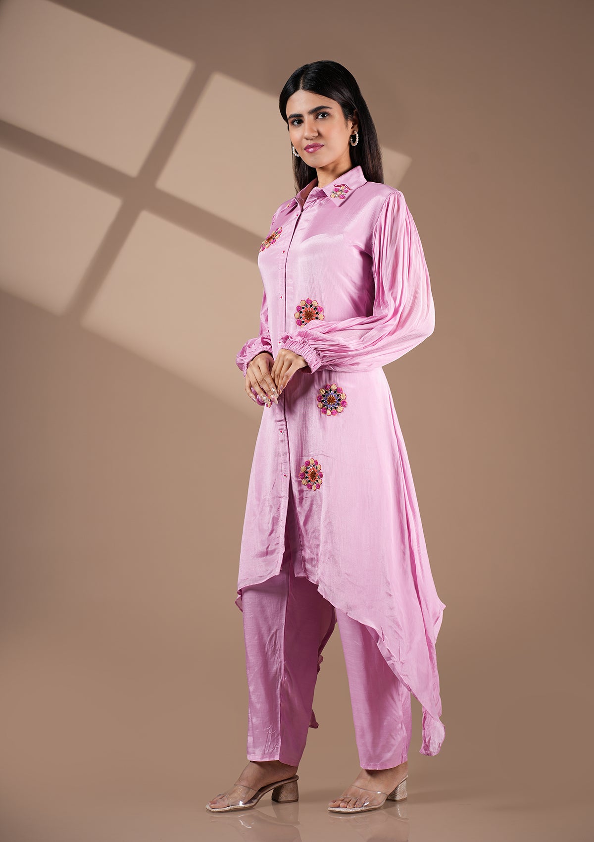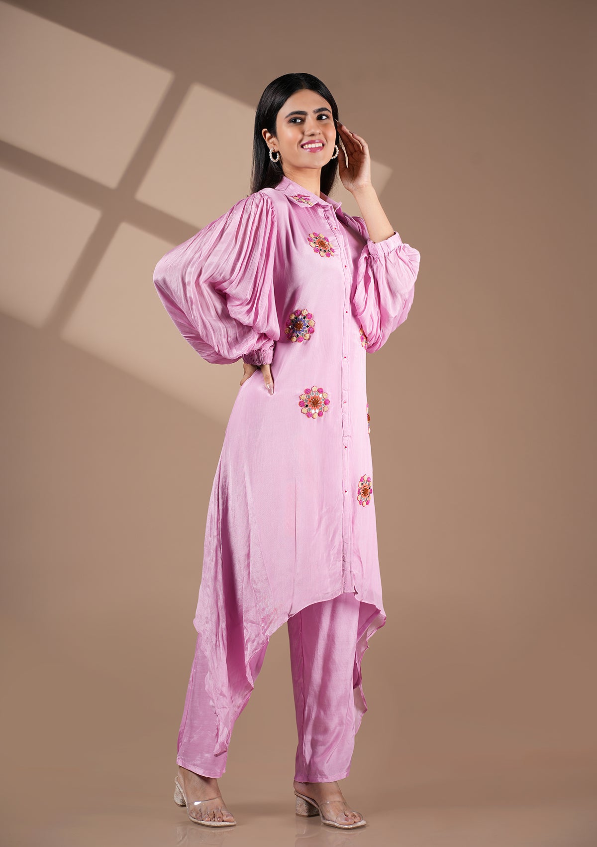 A beautiful pink co-ord set featuring statement bishop sleeves and a stylish high-low hemline kurta. The kurta is adorned with intricate floral embroidery enhanced with pearl and mirror work, paired with a sleek straight pant. With its graceful fall and refined detailing, this outfit is a perfect pick for any occasion - effortless, chic, and elegant.
