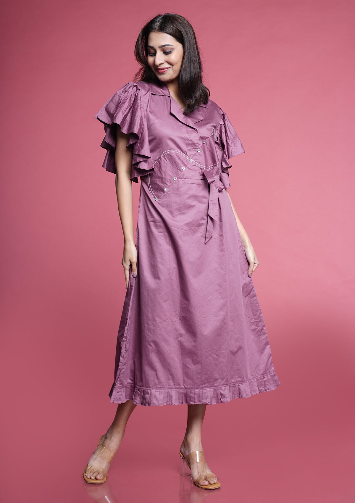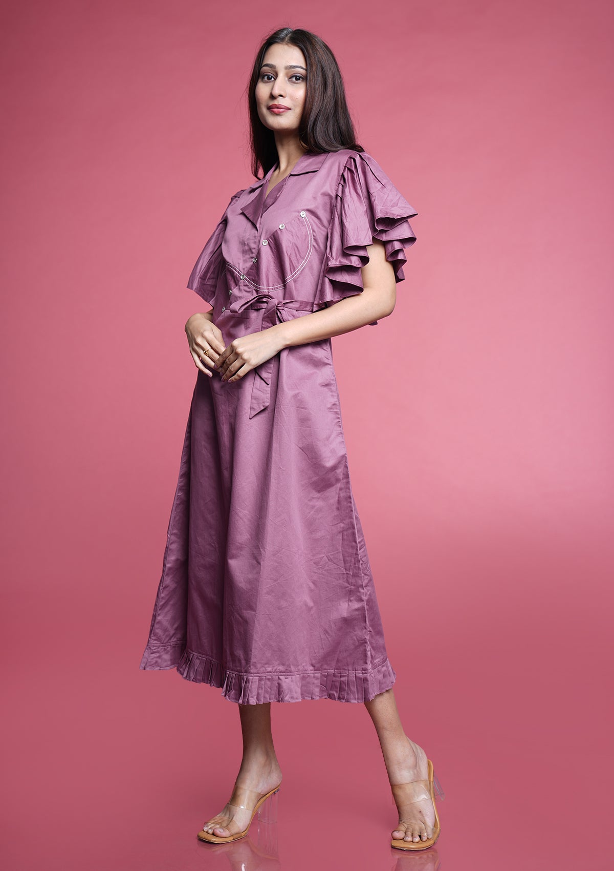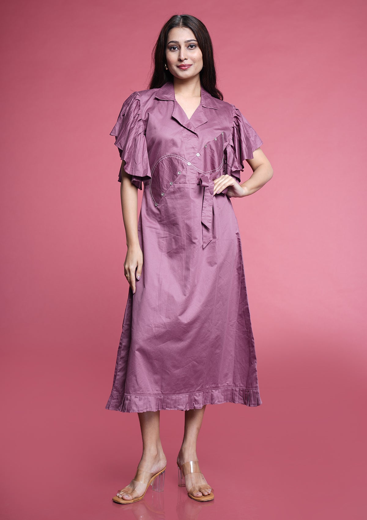 A sophisticated mauve dress crafted to make a subtle yet striking statement. It features layered ruffle sleeves paired with a notched lapel collar for an elegant silhouette. The bodice is enhanced with asymmetrical thread detailing, adding a modern artistic touch. A fabric belt at the waist cinches and shapes the body beautifully, while the front button-down design ensures effortless style and comfort.