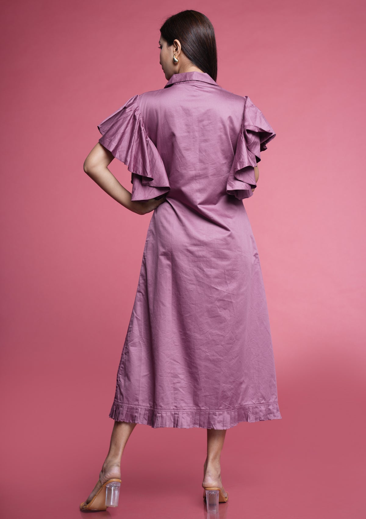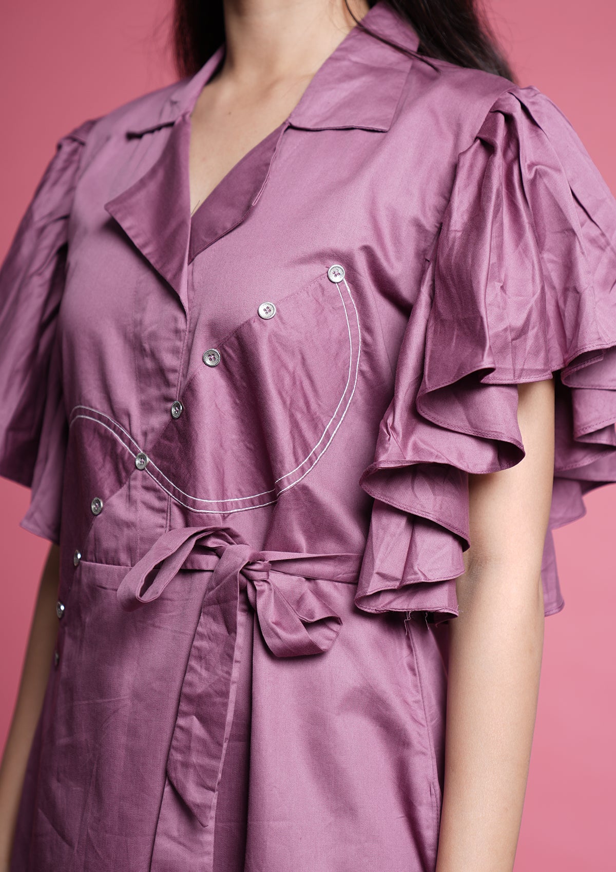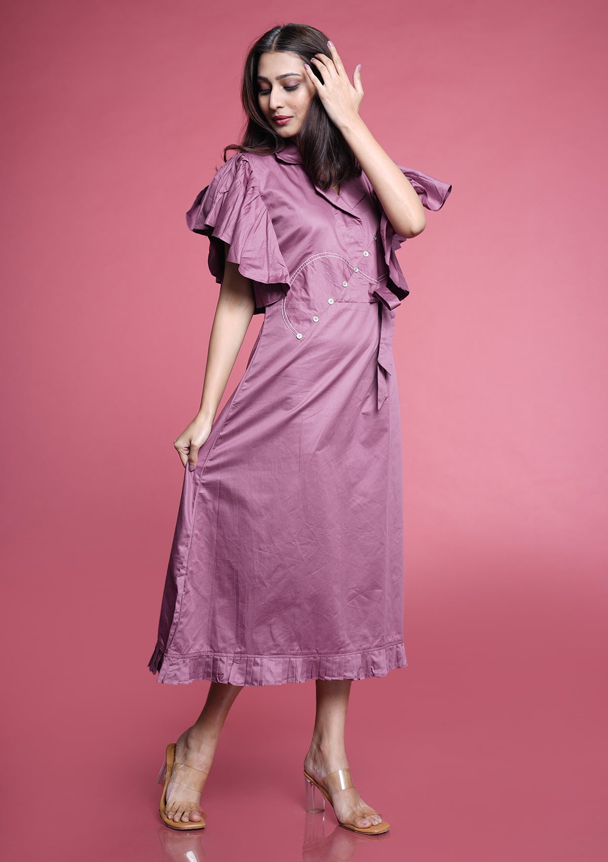 A sophisticated mauve dress crafted to make a subtle yet striking statement. It features layered ruffle sleeves paired with a notched lapel collar for an elegant silhouette. The bodice is enhanced with asymmetrical thread detailing, adding a modern artistic touch. A fabric belt at the waist cinches and shapes the body beautifully, while the front button-down design ensures effortless style and comfort.
