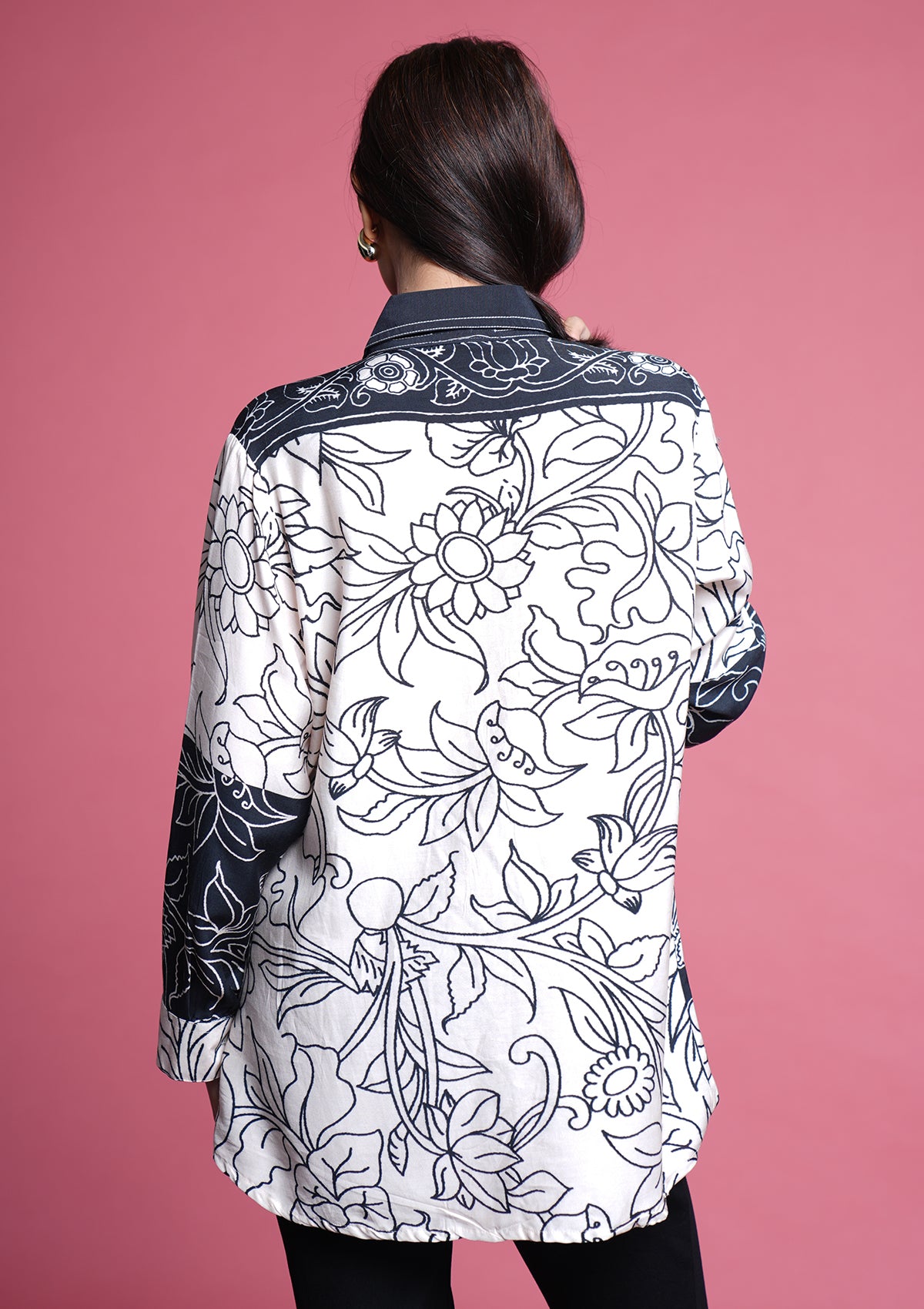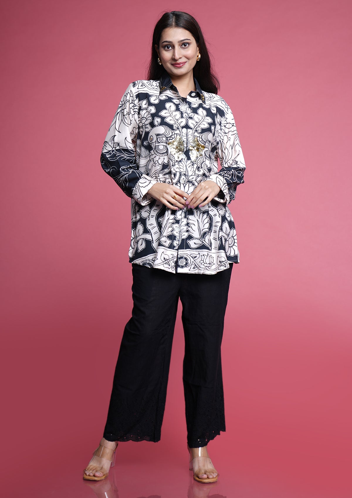 A chic black & white printed shirt in premium crepe, finished with elegant coin accents for a stylish Indo-western touch. Classy, lightweight, and super comfortable — perfect for any occasion, from casual outings to dressy events.