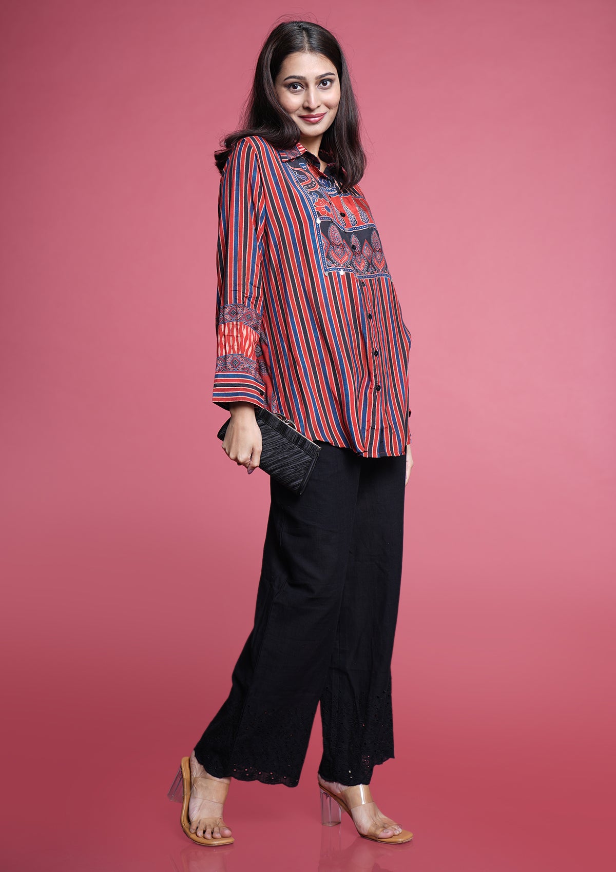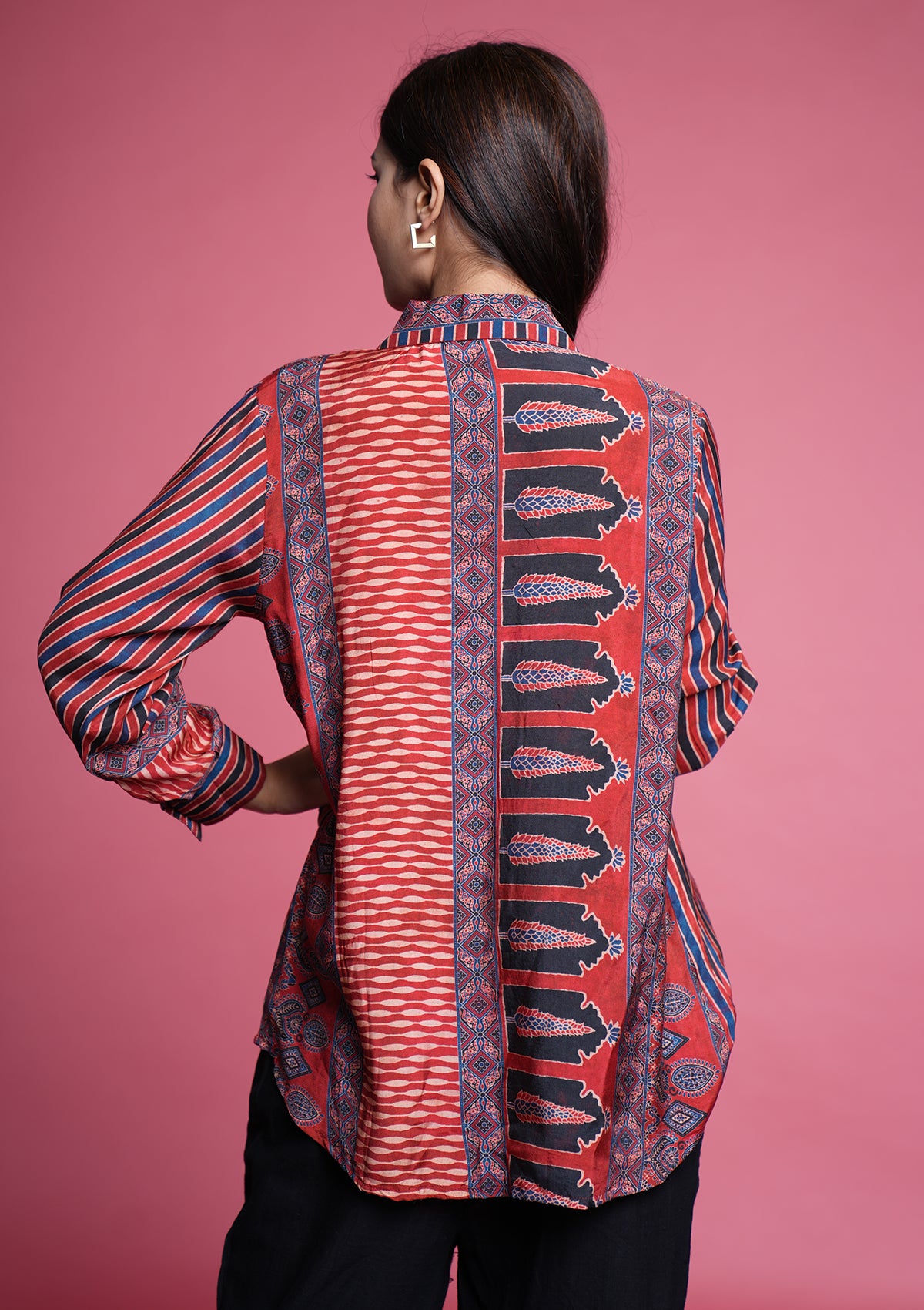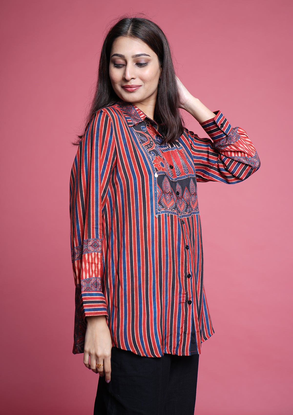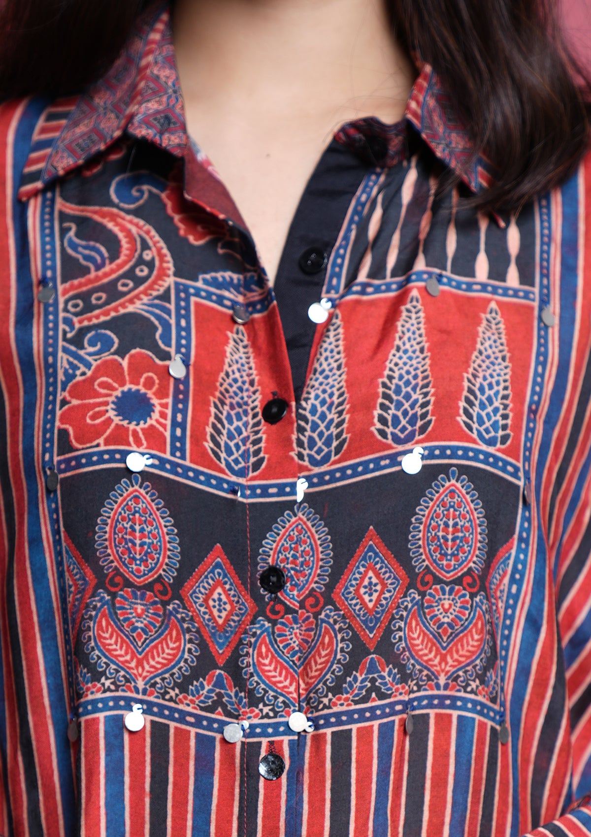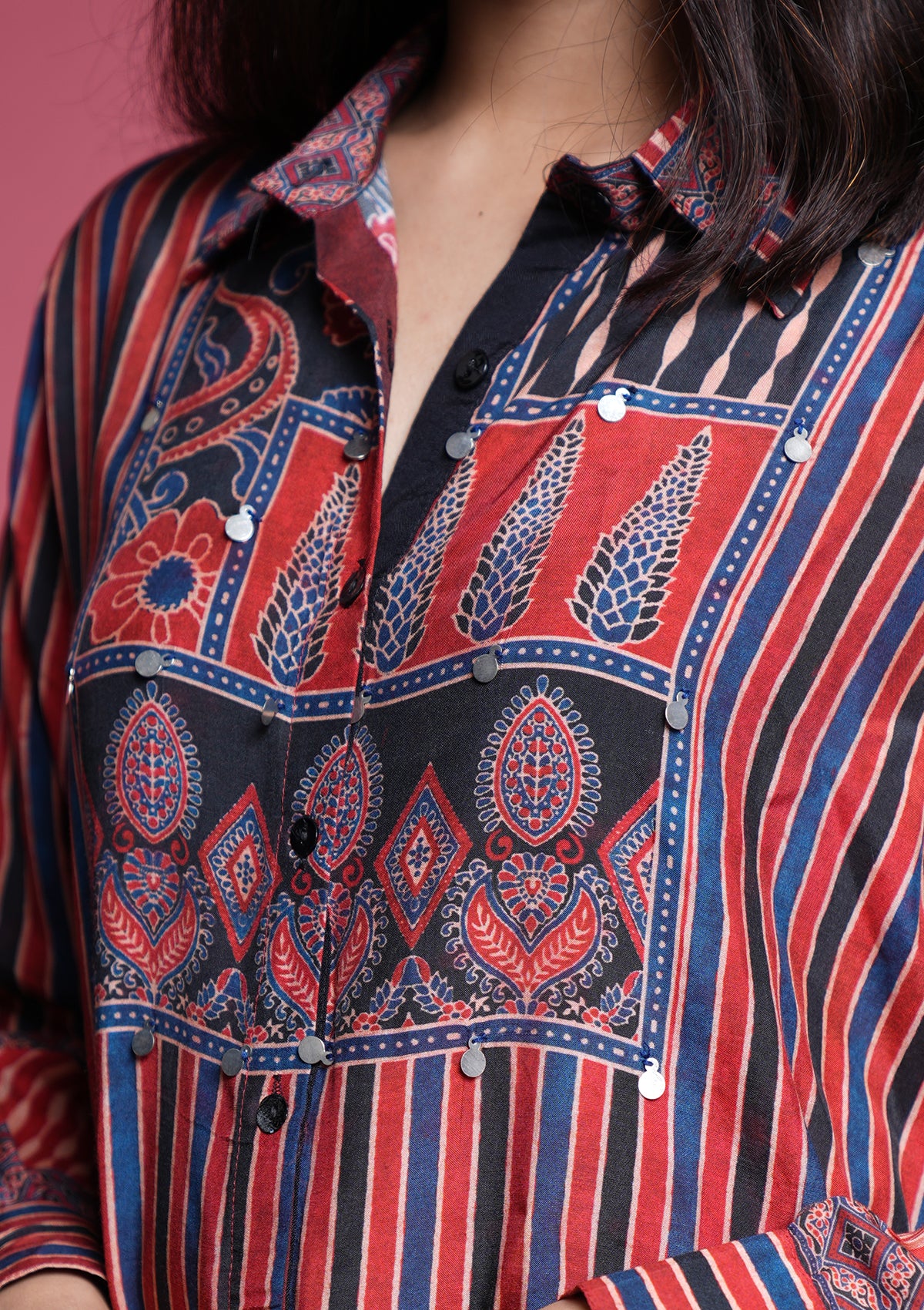 A soft muslin shirt in classic Ajrakh print, highlighted with chic coin accents for that perfect boho vibe. Trendy, lightweight, and effortlessly comfortable — ideal for any casual outing.
