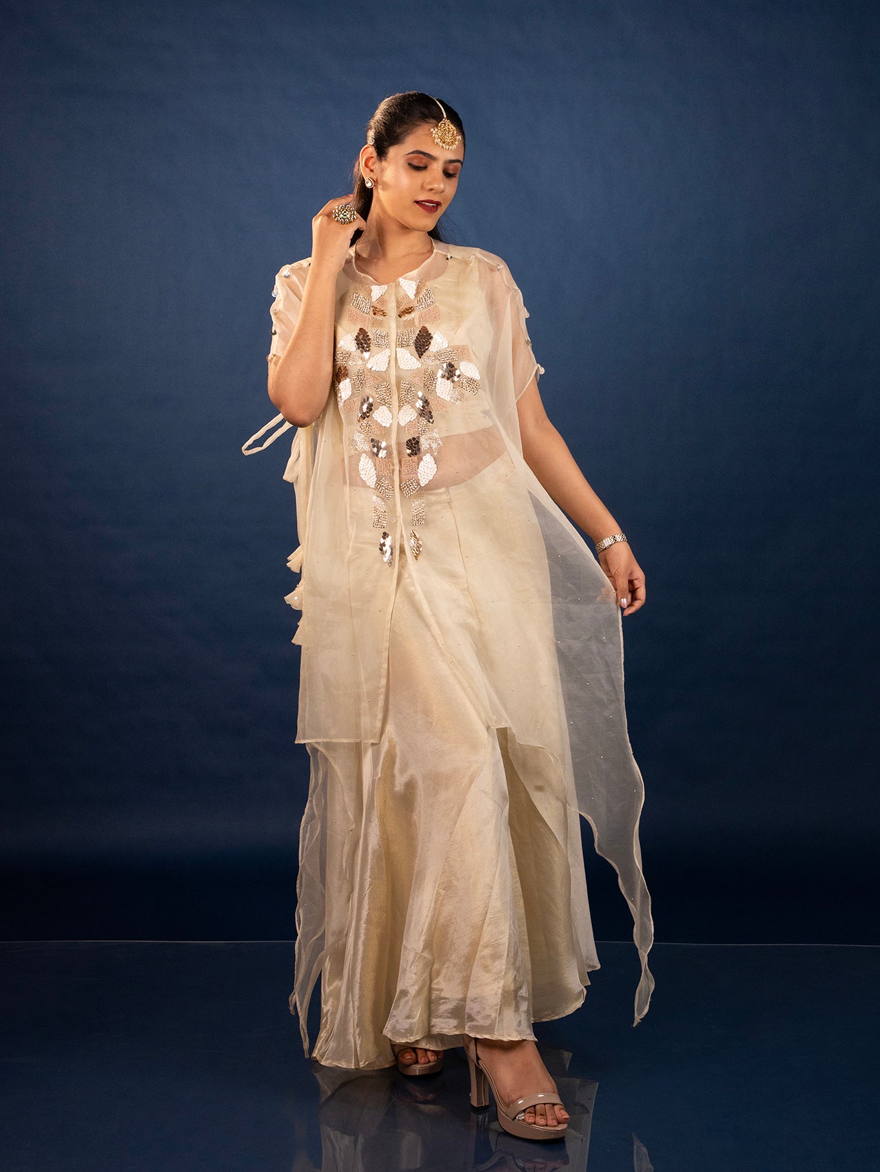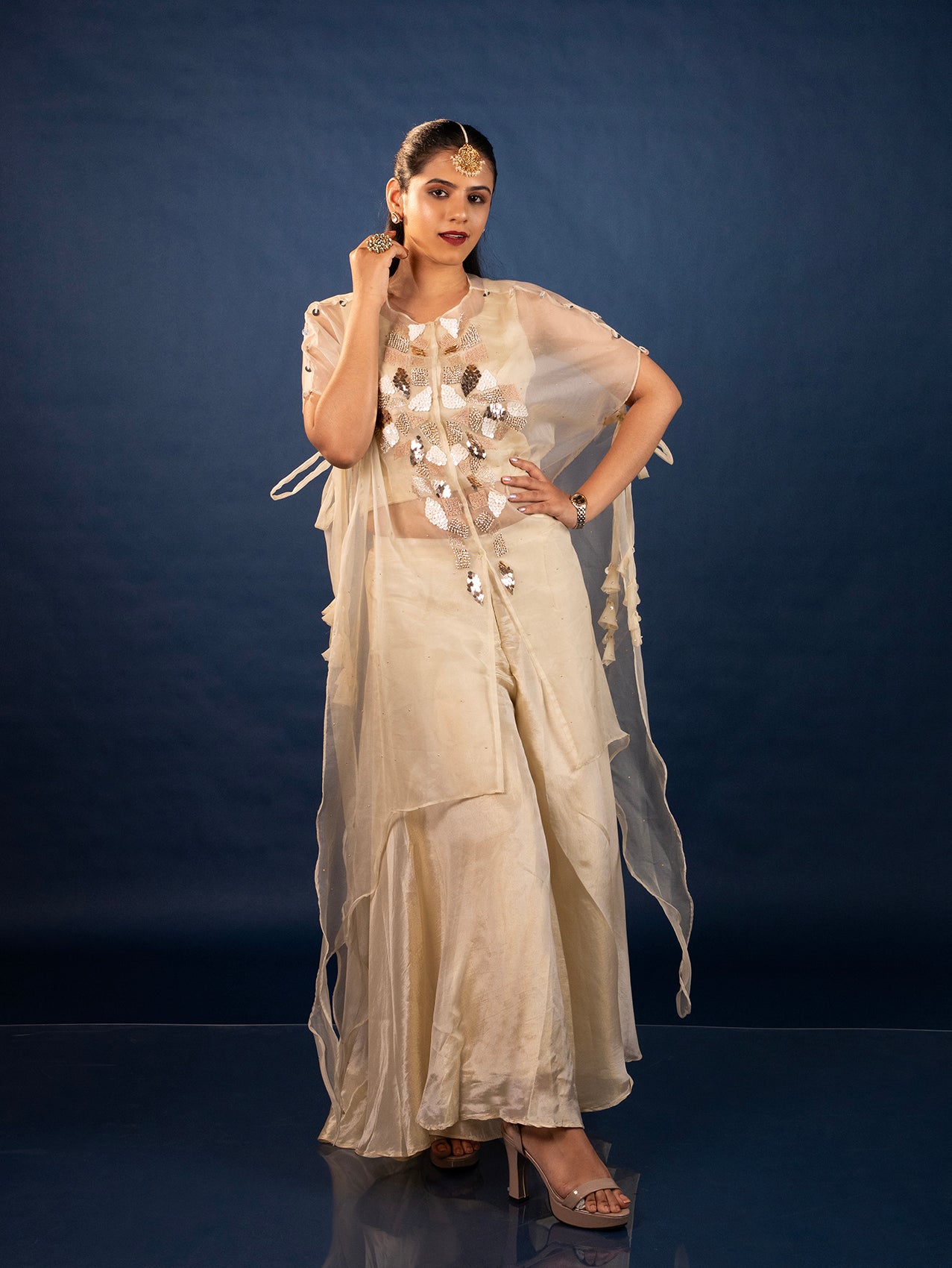 Embrace festive elegance with this contemporary Cape Set, adorned with all-over Mukaish work and delicate pearl tassel detailing that adds a graceful charm. The neckline features heavy hand embroidery with intricate embellishments, bringing in a rich and regal feel. Paired with a stylish crop top and flowing palazzo pants, this outfit is perfect for festivals, weddings, and special occasions where you want to make a lasting impression.