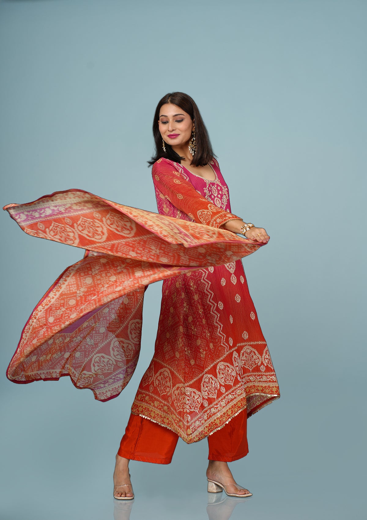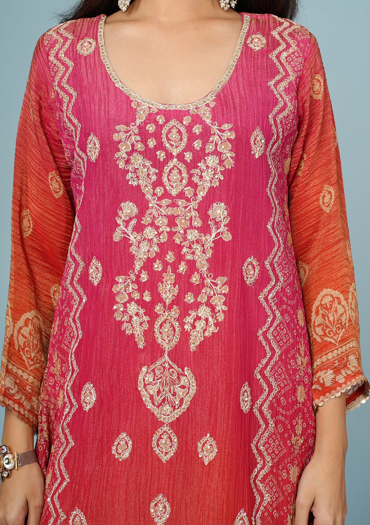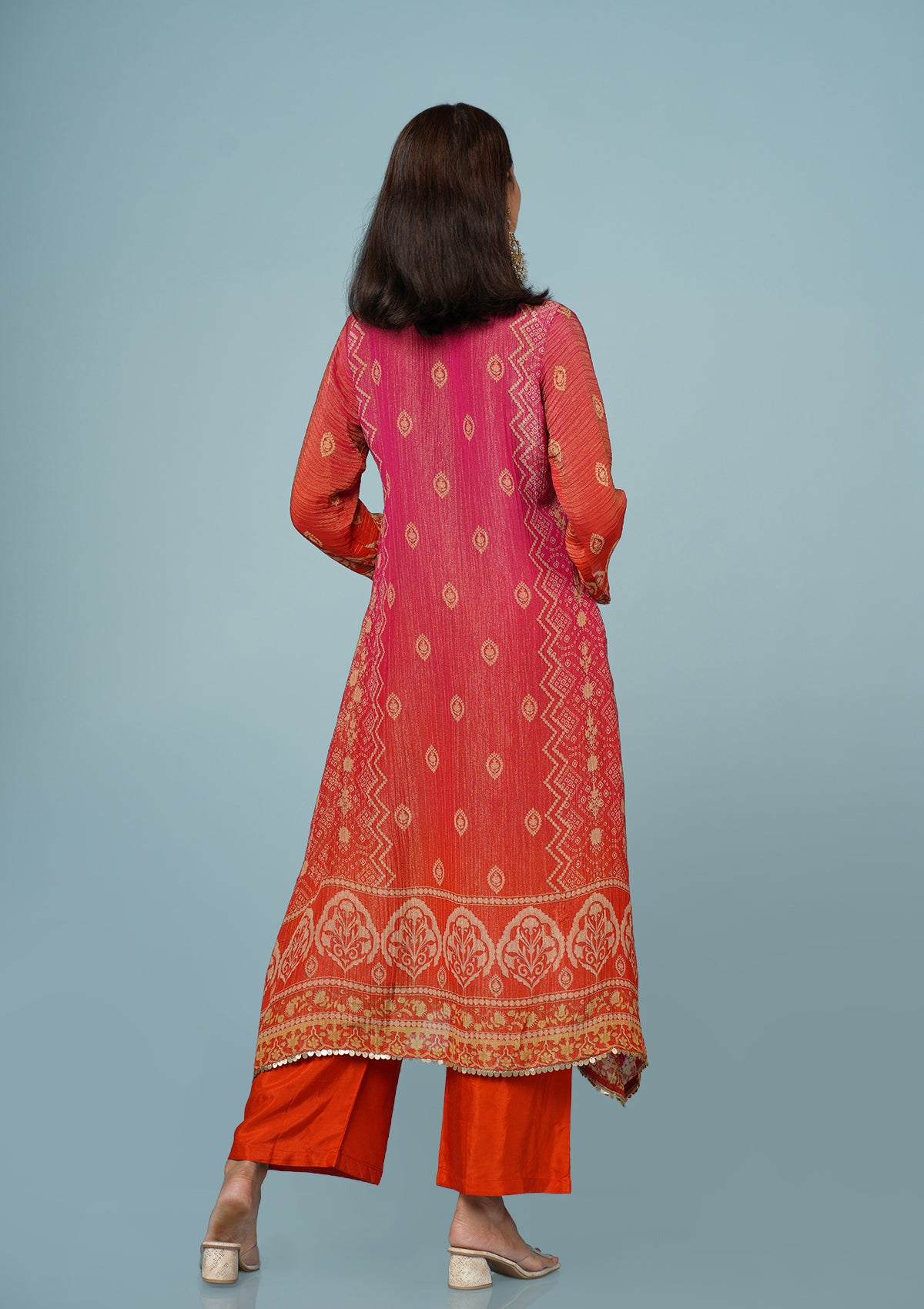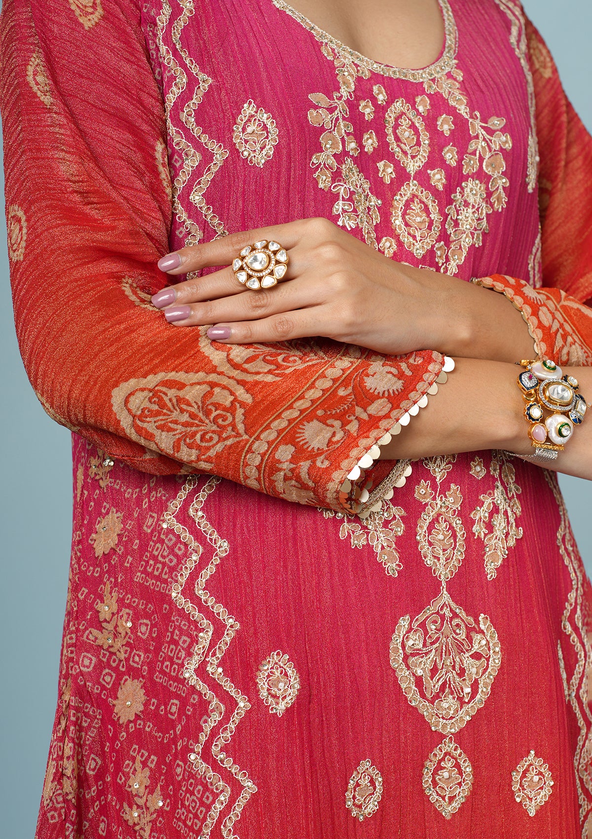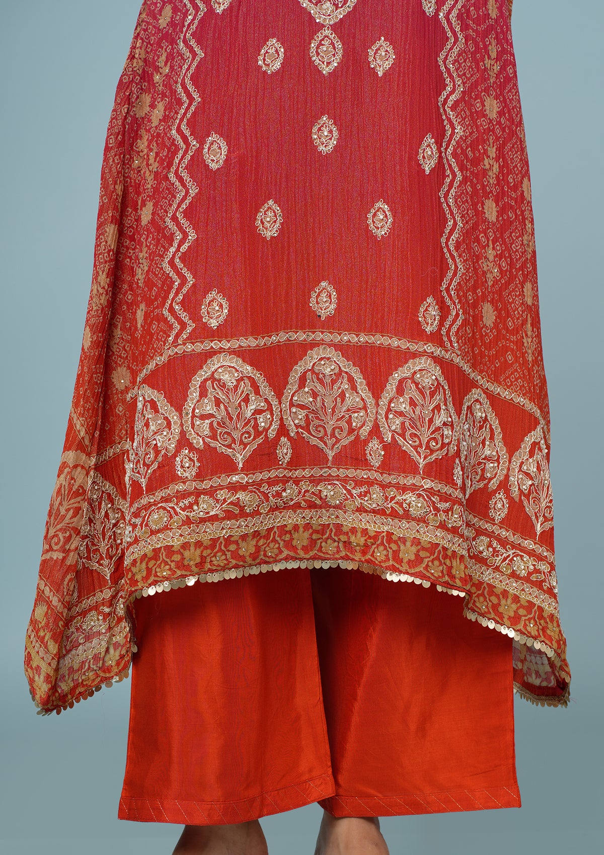 Coral Red Shimmer Tissue Suit with Zari & Dabka Embroidery