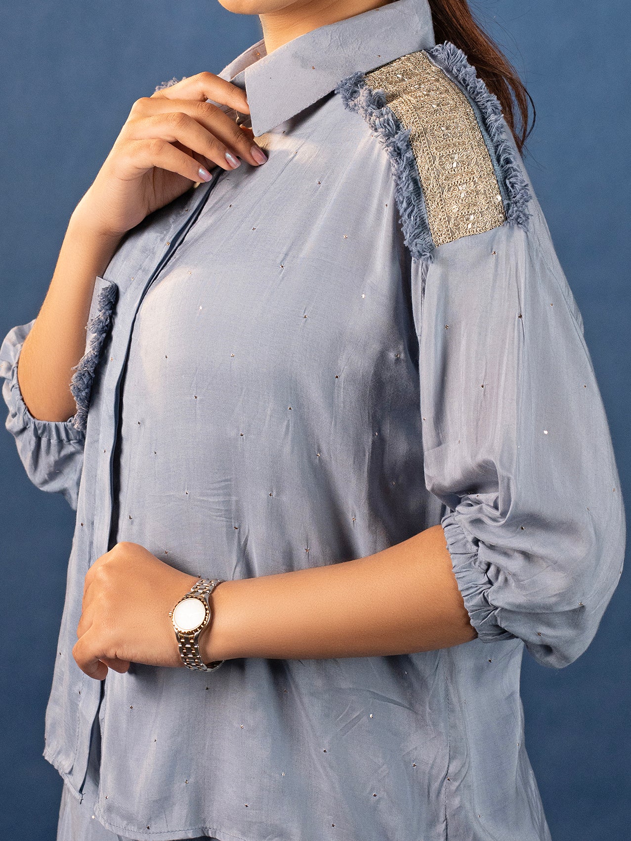 Muslin Shirt & Palazzo With Zardozi Patchwork - Powder Blue