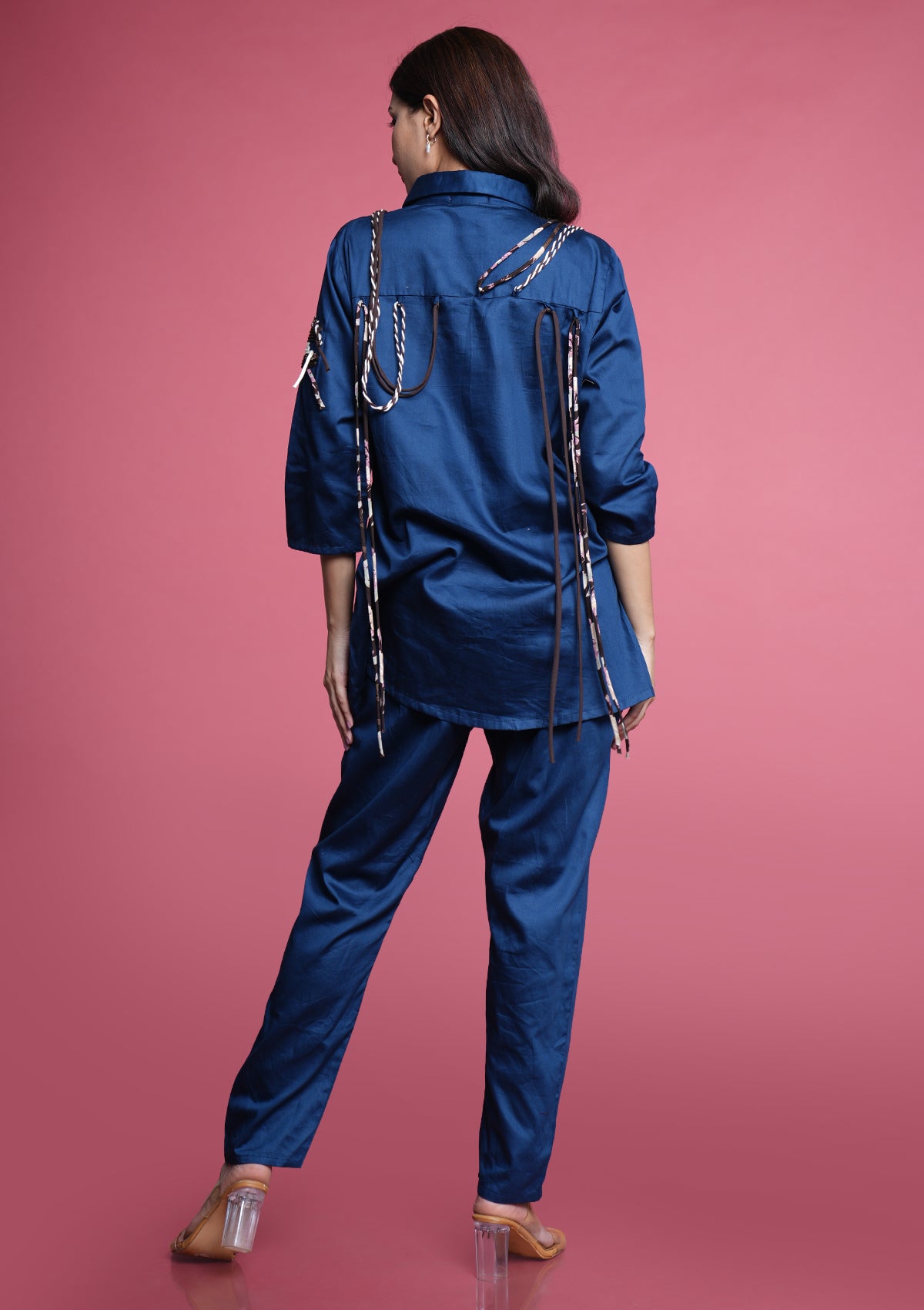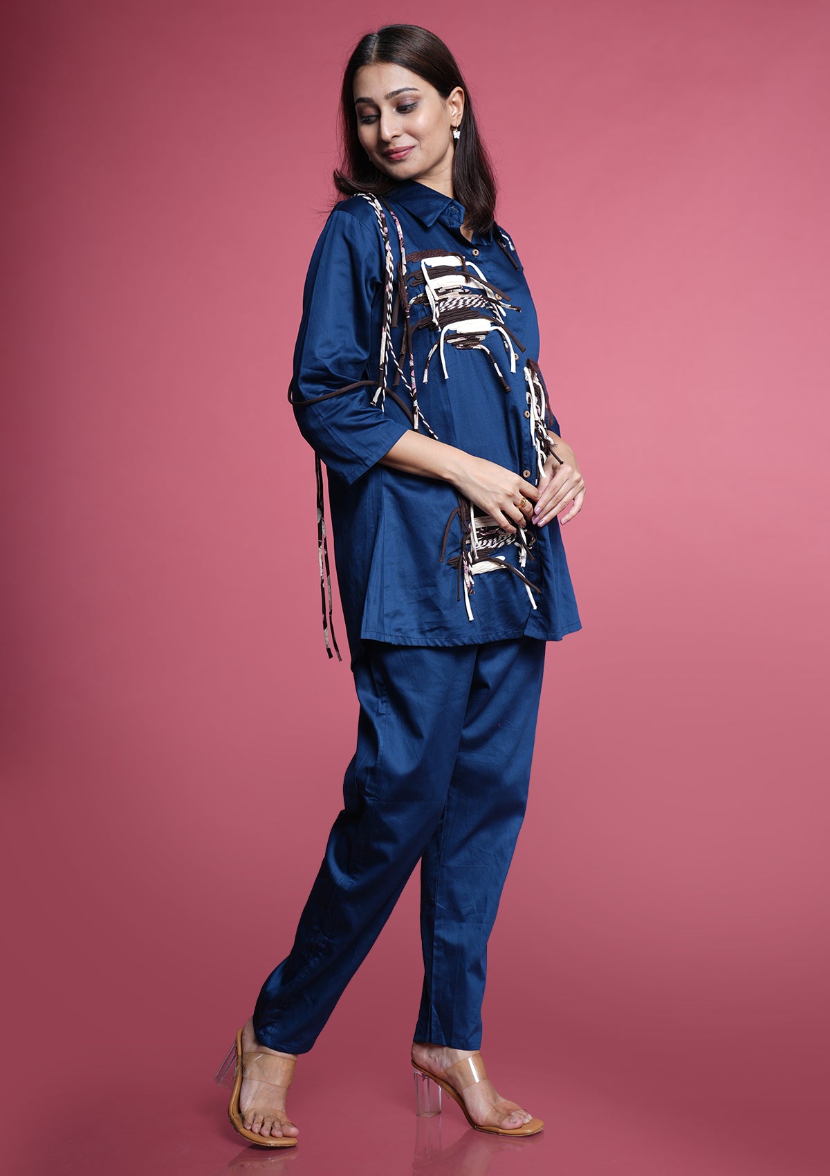 Make a bold statement with this premium cotton co-ord set, highlighted by its unique 3D braided cord detailing crafted with textured cords in shades of brown and cream. The back features dramatic vertical braided tassel cords running from shoulder to mid-back, adding an unforgettable flair. Paired with coordinated pants, this set is super comfortable yet effortlessly stylish.