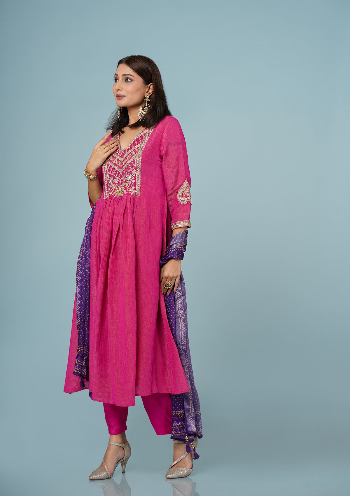 Step into timeless elegance with our pure shimmer crush Suit, paired with a contrasting Bandhani print dupatta that adds a vibrant festive touch. The tunic features intricate traditional Zardozi and Aari embroidery, highlighted with Resham thread and sequin detailing on the neckline and sleeves, making it a true celebration of craftsmanship.