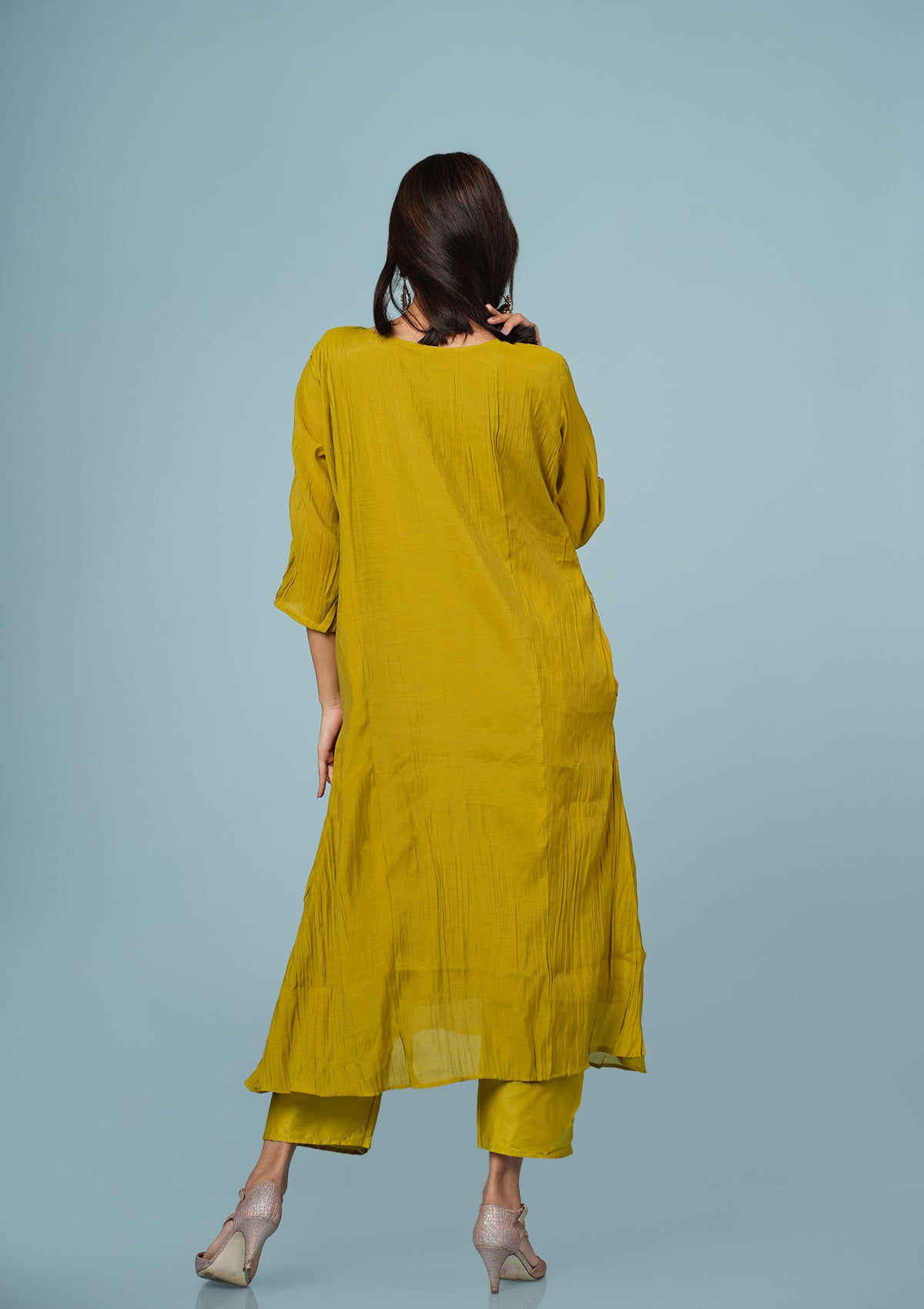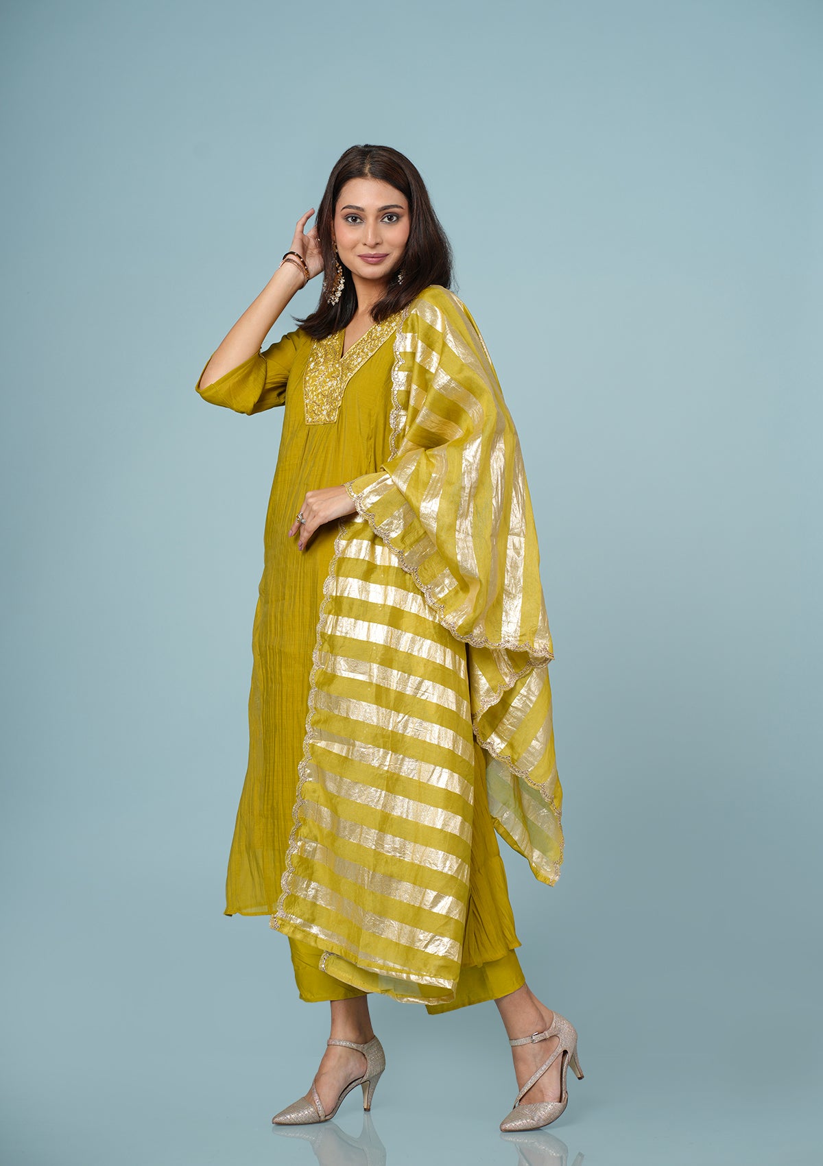 A graceful pure Chinon suit featuring intricate zari embroidery with sequin and pearl detailing on the neckline and sleeves. The pockets are highlighted with matching patchwork for a refined touch. The dupatta showcases golden zari stripes and sequin lace edging, adding subtle shimmer. A simple yet elegant ensemble, perfect for festive occasions and celebrations.
