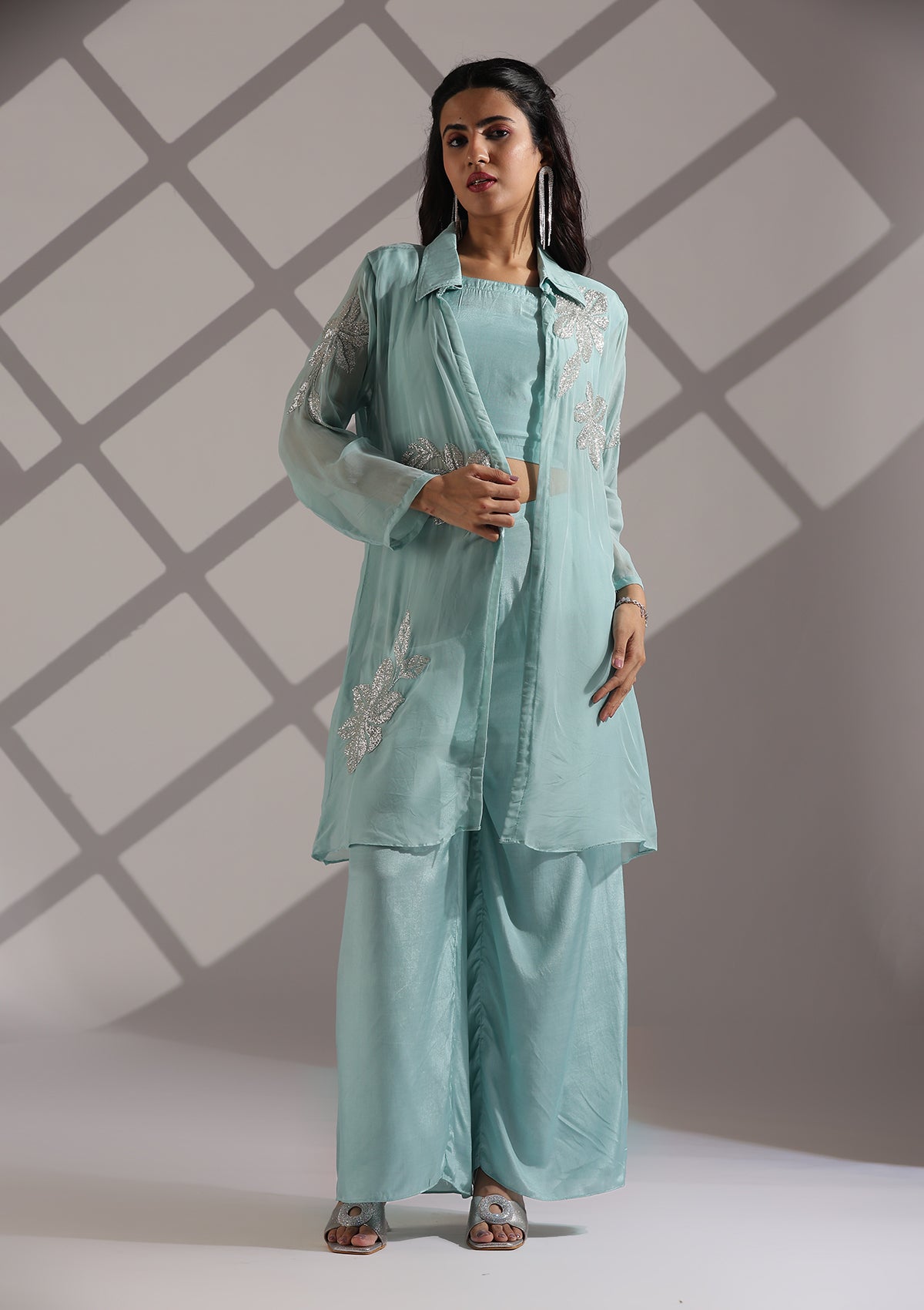 Statement 3 Piece Indowestern Set with Organza Jacket - Ice Blue
